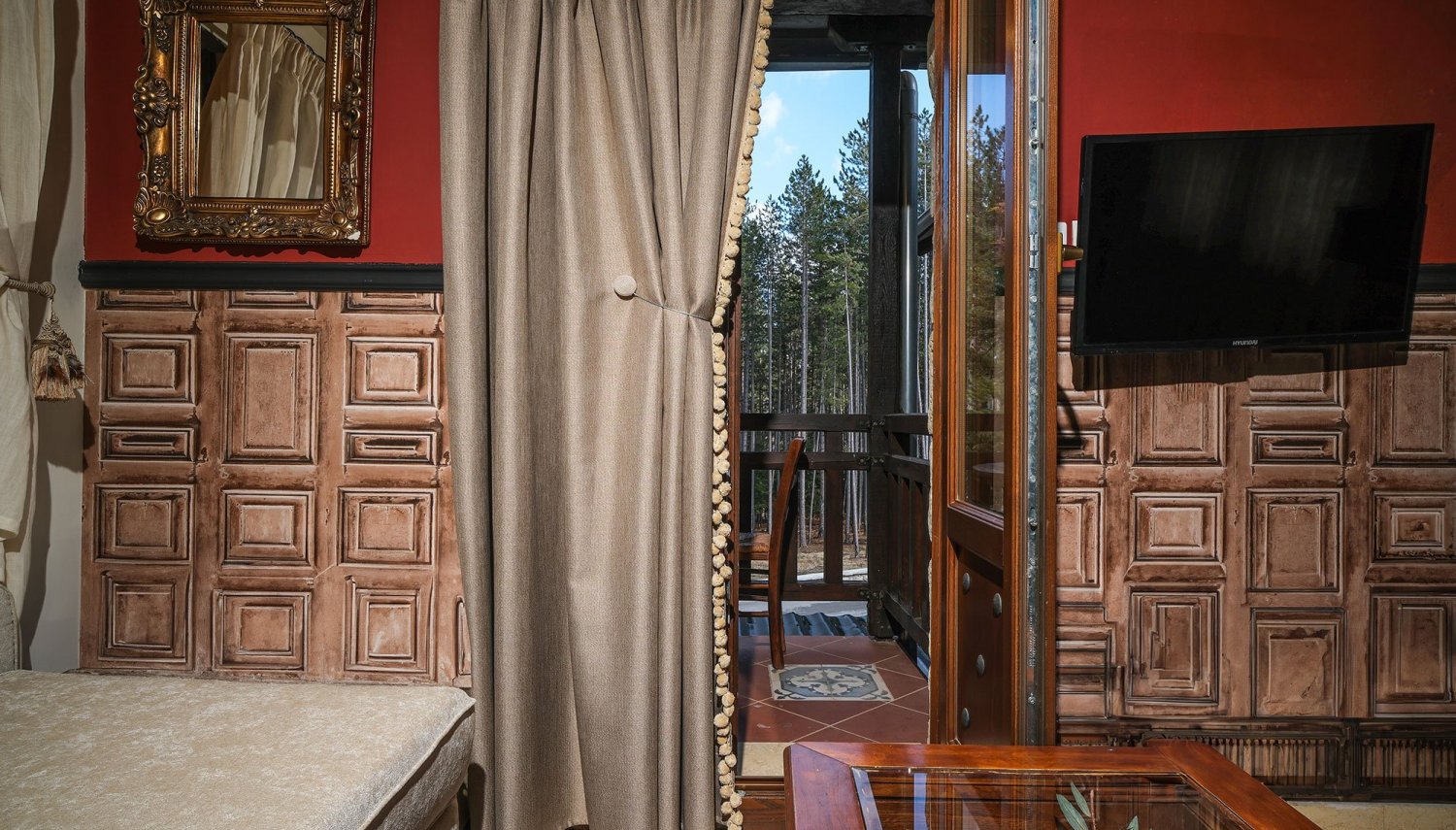 The villa exudes an atmosphere from another era, with a strong medieval character highlighted through the choice of materials and decor. Stone, hand-carved chestnut wood, distinctive tiles, and antique marble flooring come together to form a cohesive canvas that blends harmoniously with the antiques adorning every corner of the space. The ambiance creates a unique, warm, and aristocratic feel that transports guests back in time.